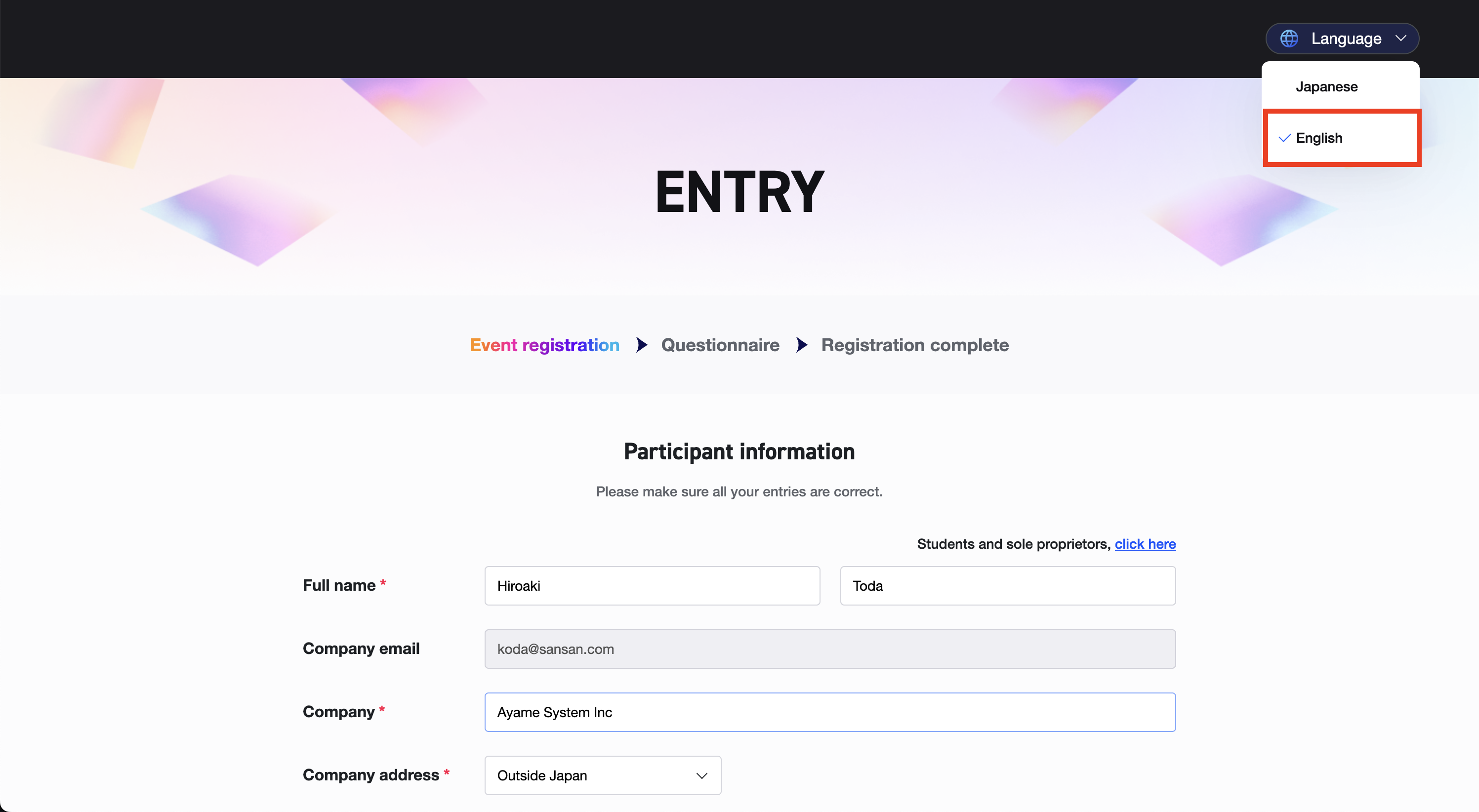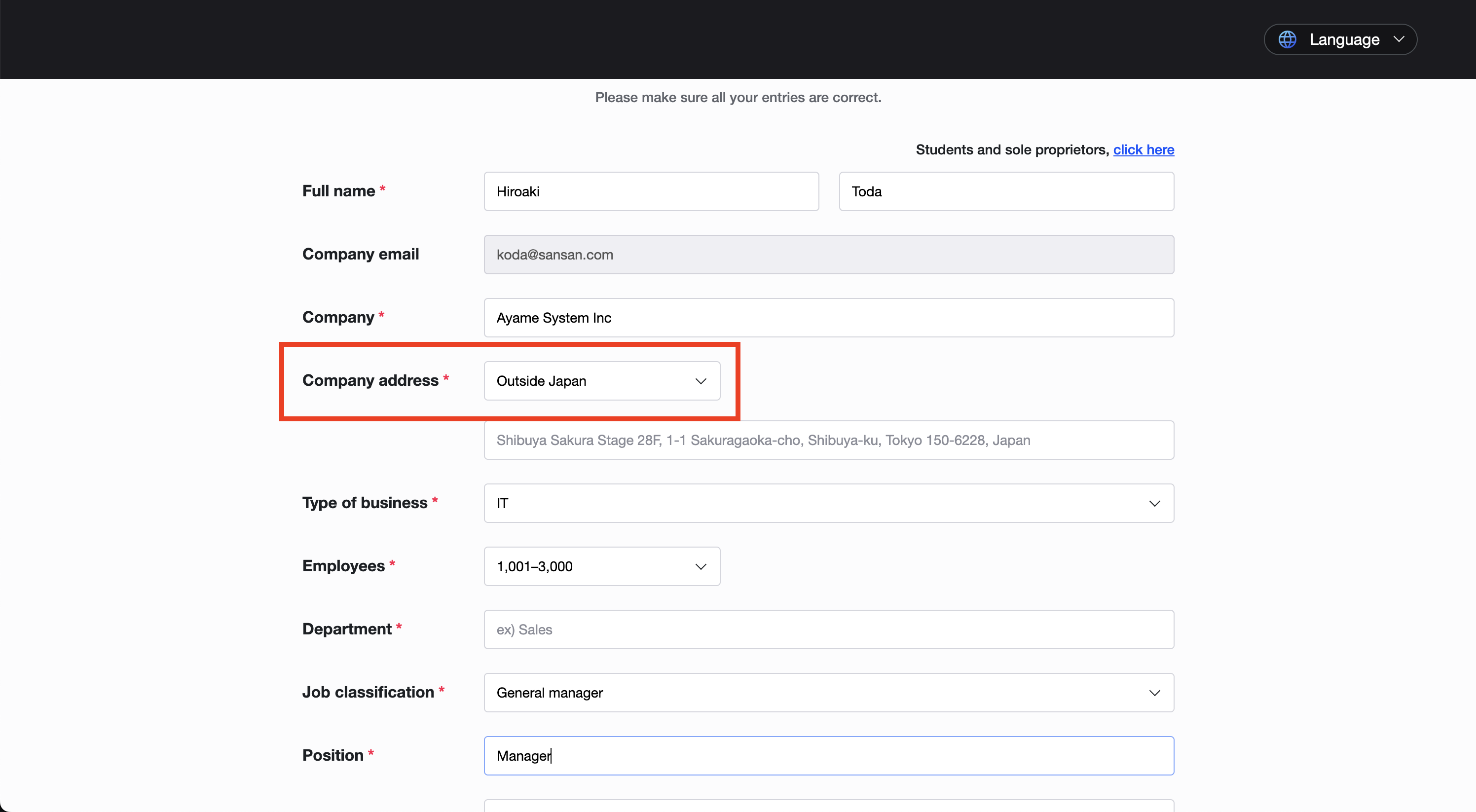 Company addressの欄で「Outside Japan」を選択してください。