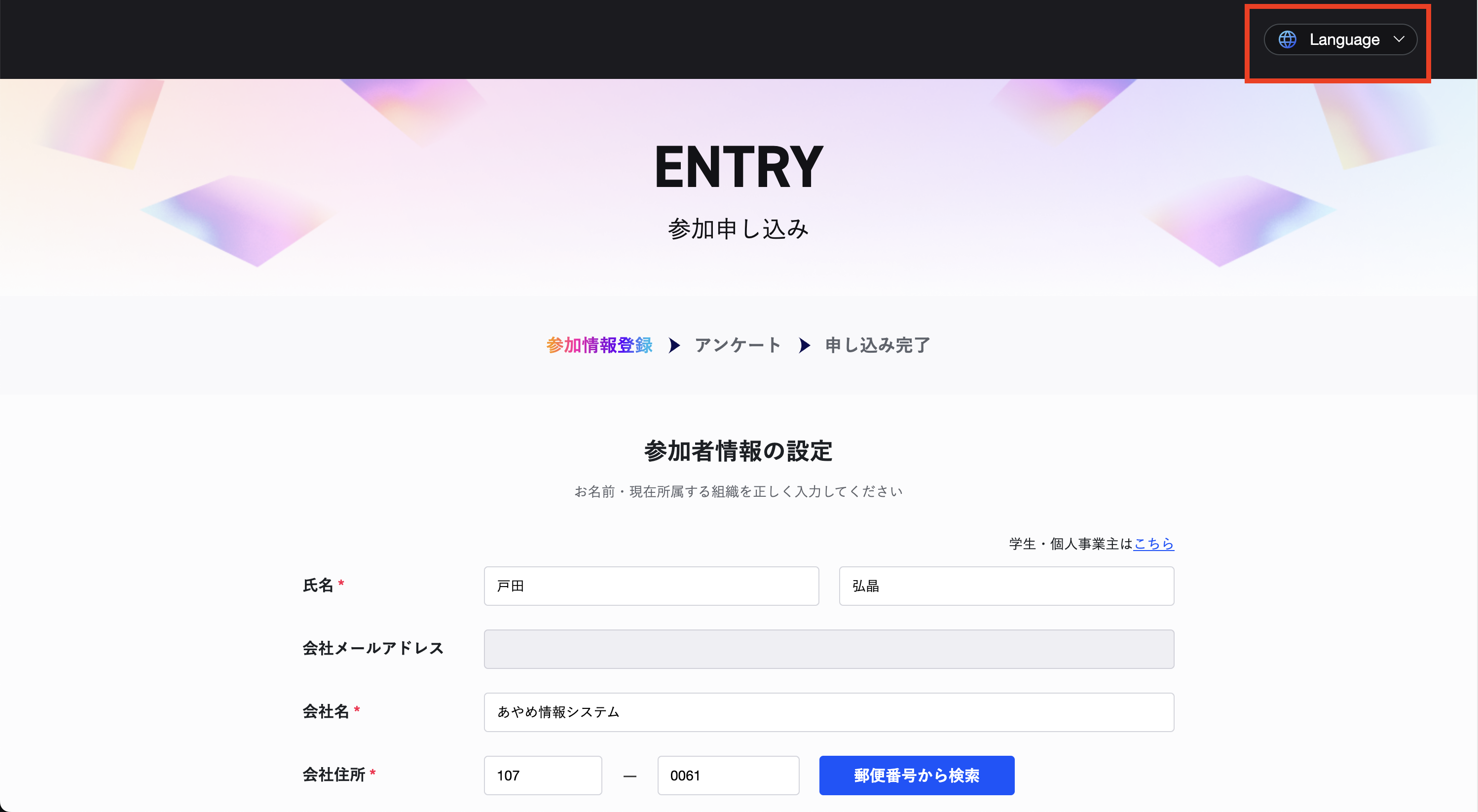 参加者情報の設定画面の右上にある「Language」ボタンをクリックすると、言語の切り替えができます。