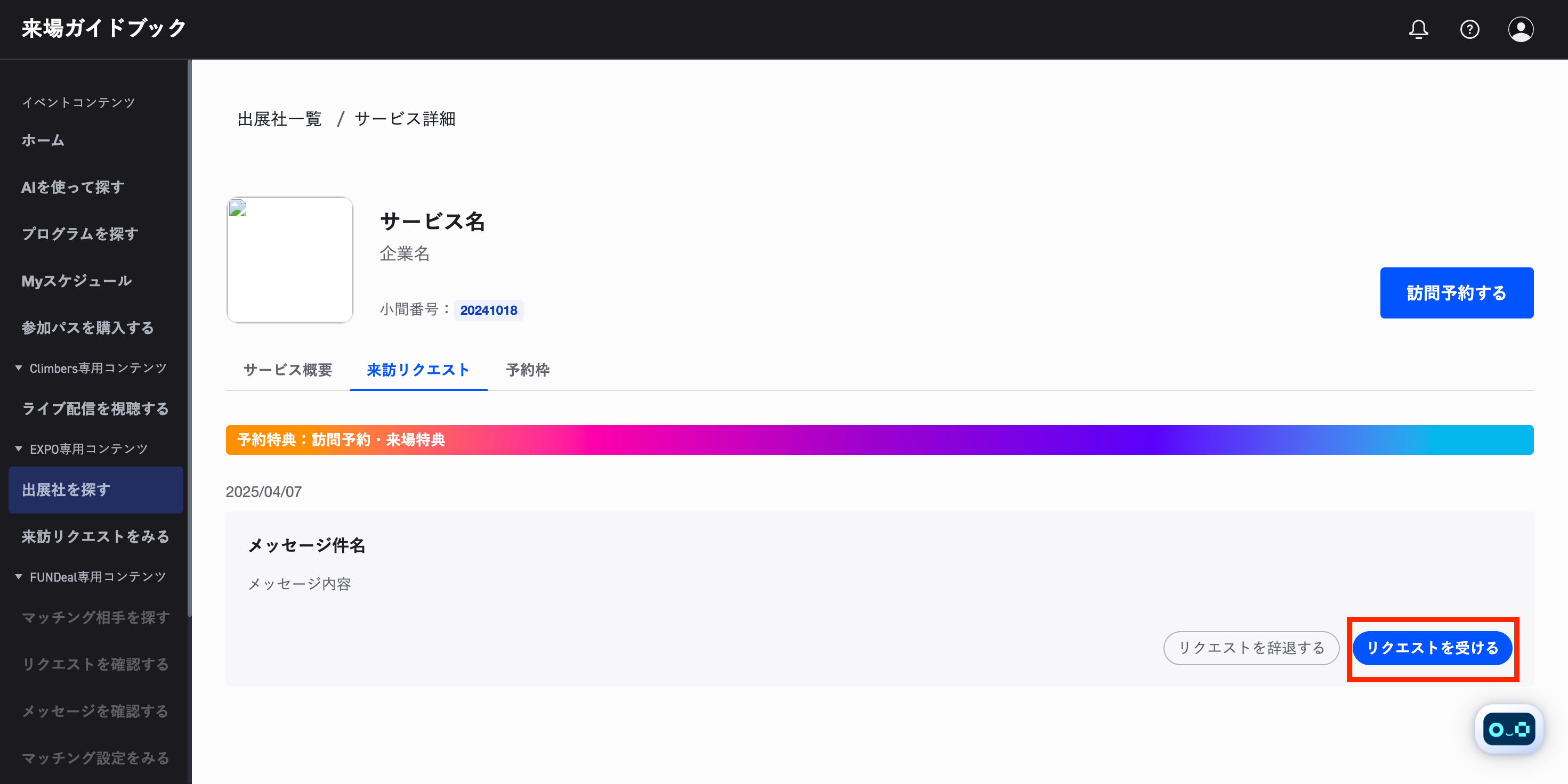 出展ブースからブースへの来訪リクエストメッセージが届く場合があります。