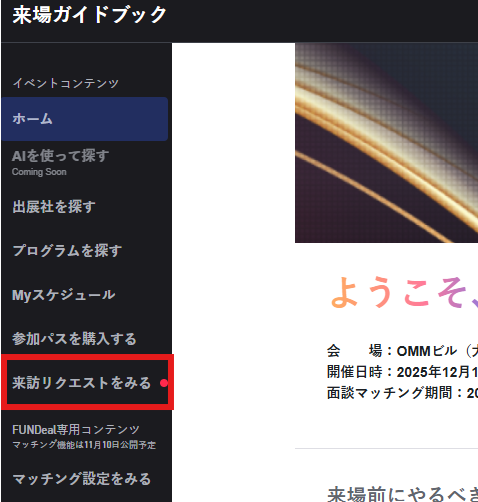 リクエスト通知は、来場ガイドブックまたはメールへ届きます。