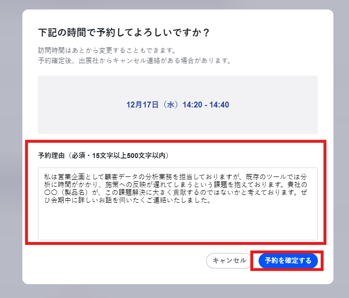気になる企業からの来訪リクエストがあれば、訪問予約を積極的に行っていただき、展示会での時間を有効活用しましょう。