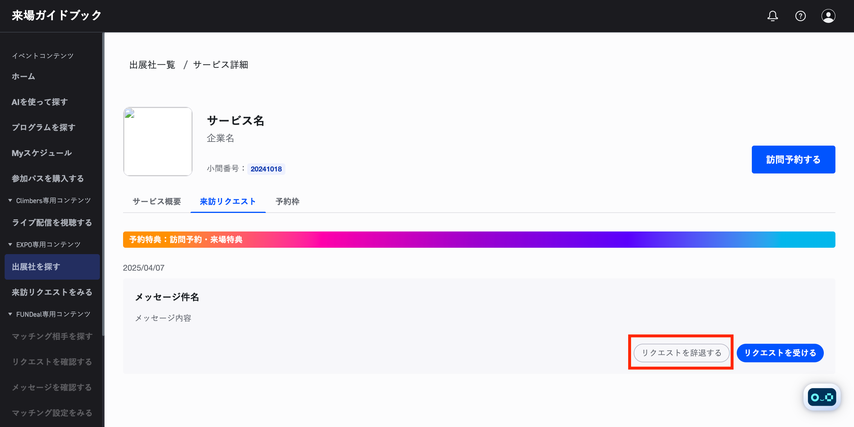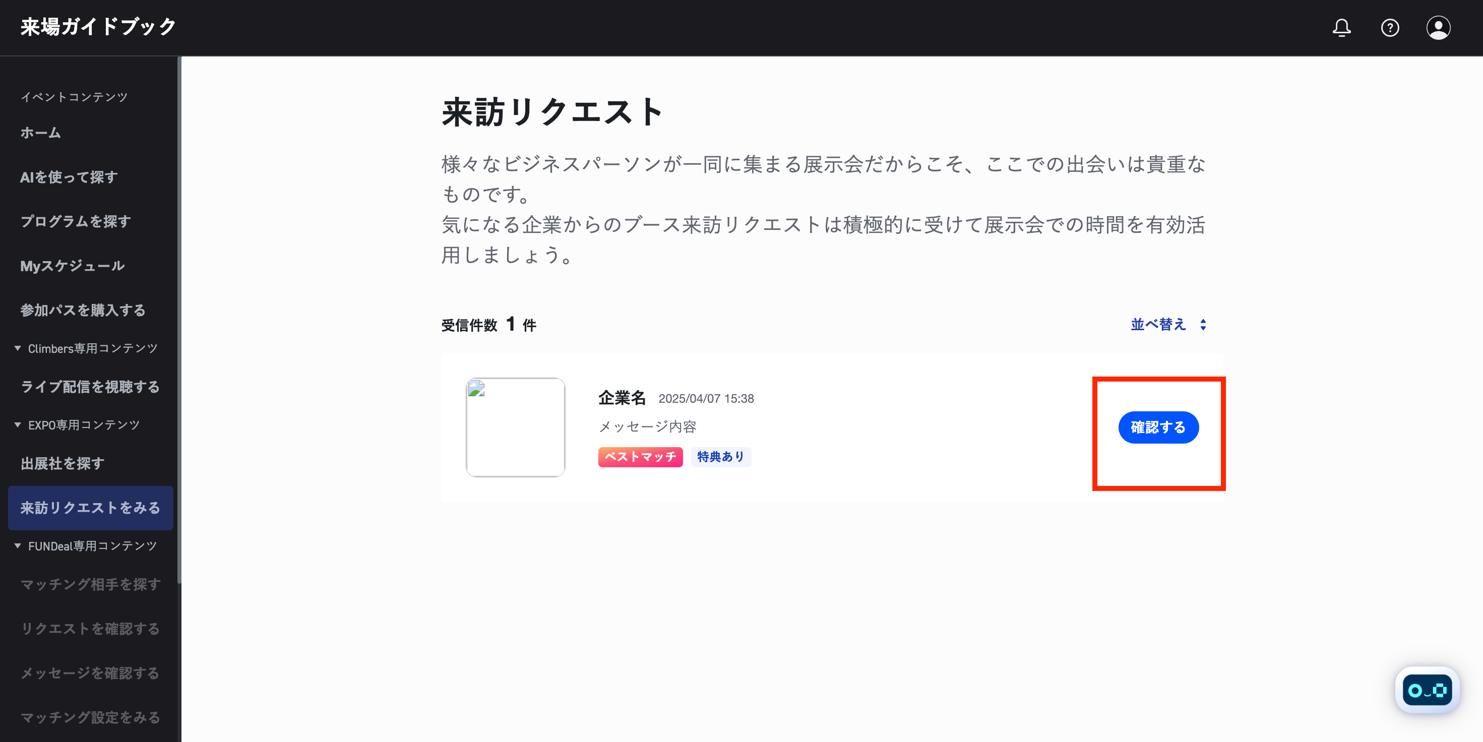 出展ブースからブースへの来訪リクエストメッセージが届く場合があります。